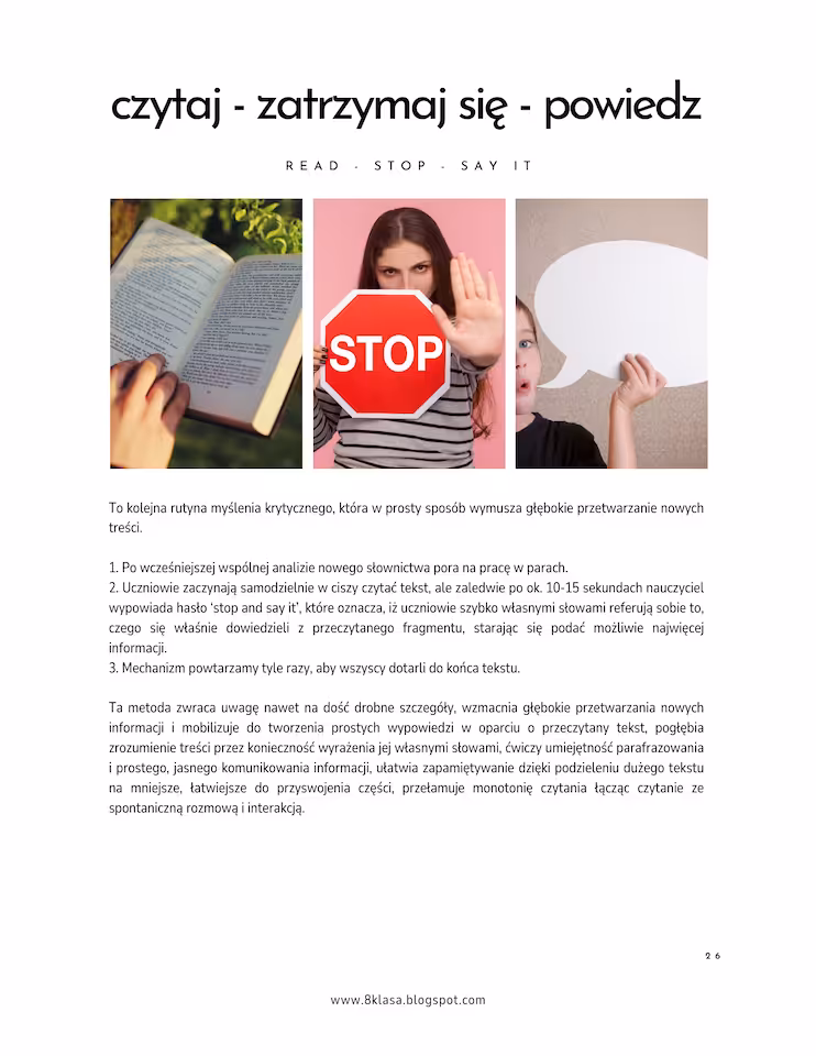 sprawdzone strategie i ćwiczenia rozwijające czytanie ze zrozumieniem, myślenie krytyczne oraz szybkie zapamiętywanie;